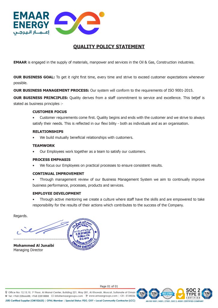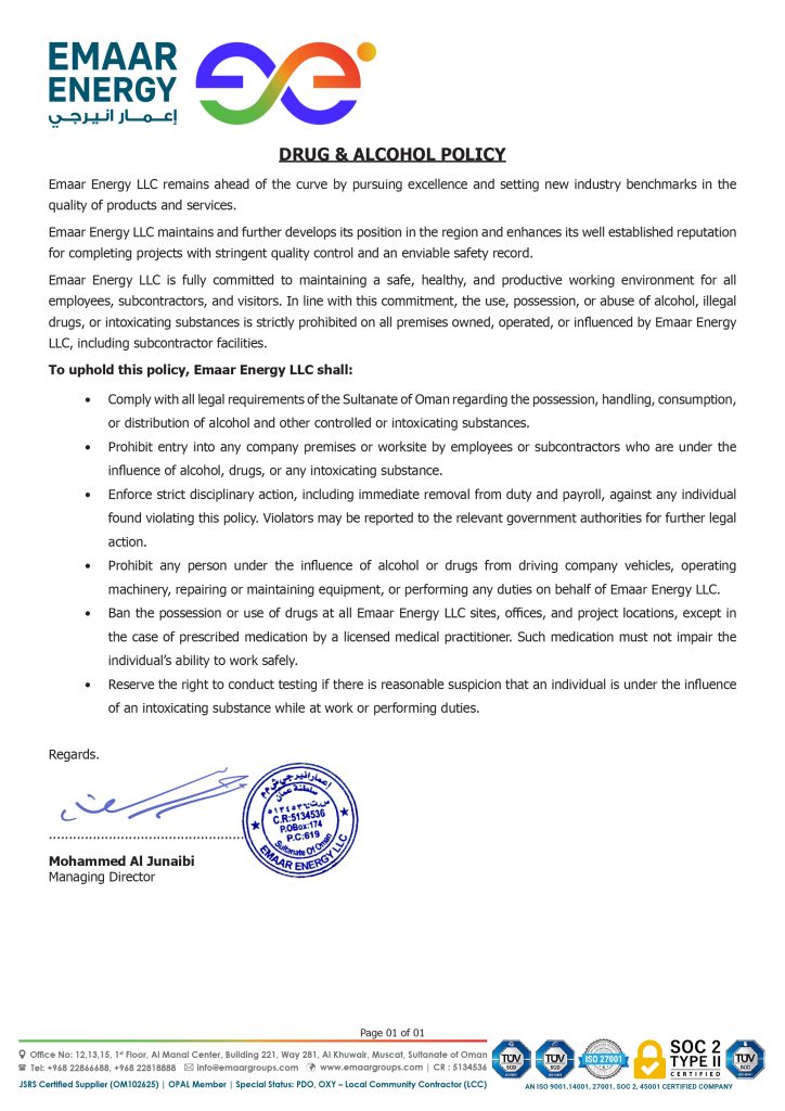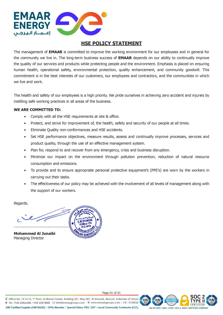 Health, Safety, Security and Environmental (HSSE) protection is our priority. At EMAAR, we always aim to operate a safe, healthy and environmentally friendly business, and recognize the right of all our employees to work in a safe and healthy work environment. We strive to identify and take all reasonable steps to minimize risks to health, safety, sustainability and environmental integrity. The success of this approach is highlighted by our track record of 0 incidents at site in 12 years of operations. Our commitment to HSSE includes and defines: